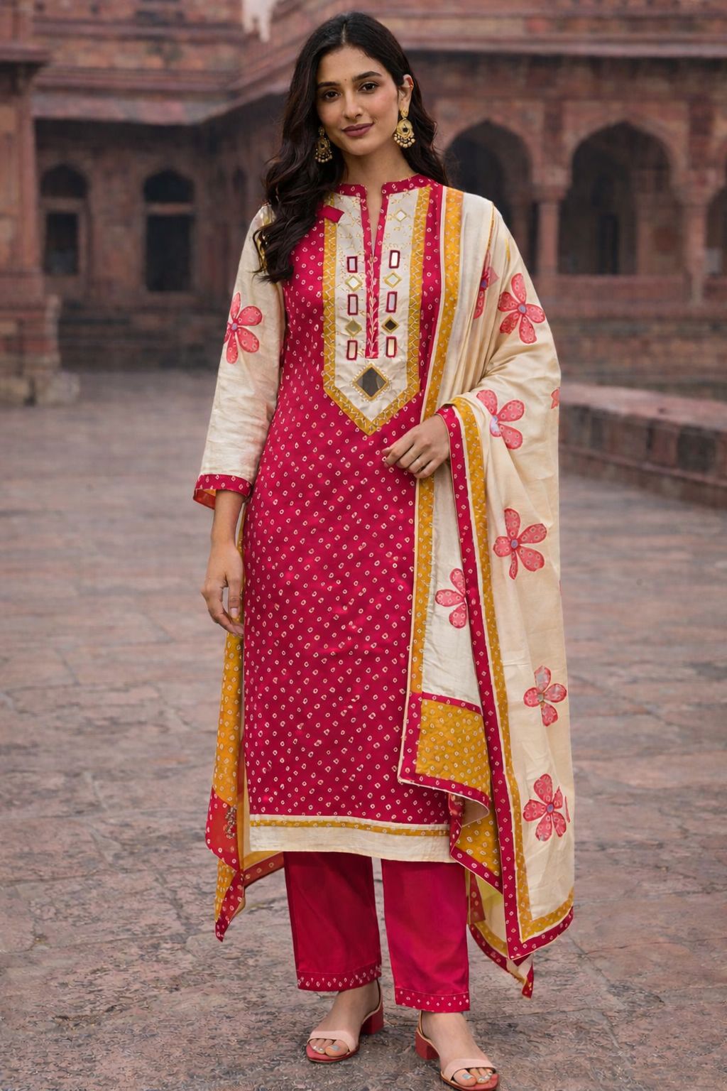 This elegant Bandhej suit is a perfect blend of tradition and subtle detailing. The shirt features classic Bandhej print, beautifully enhanced with delicate mirror work on the neckline, adding just the right amount of festive sparkle.