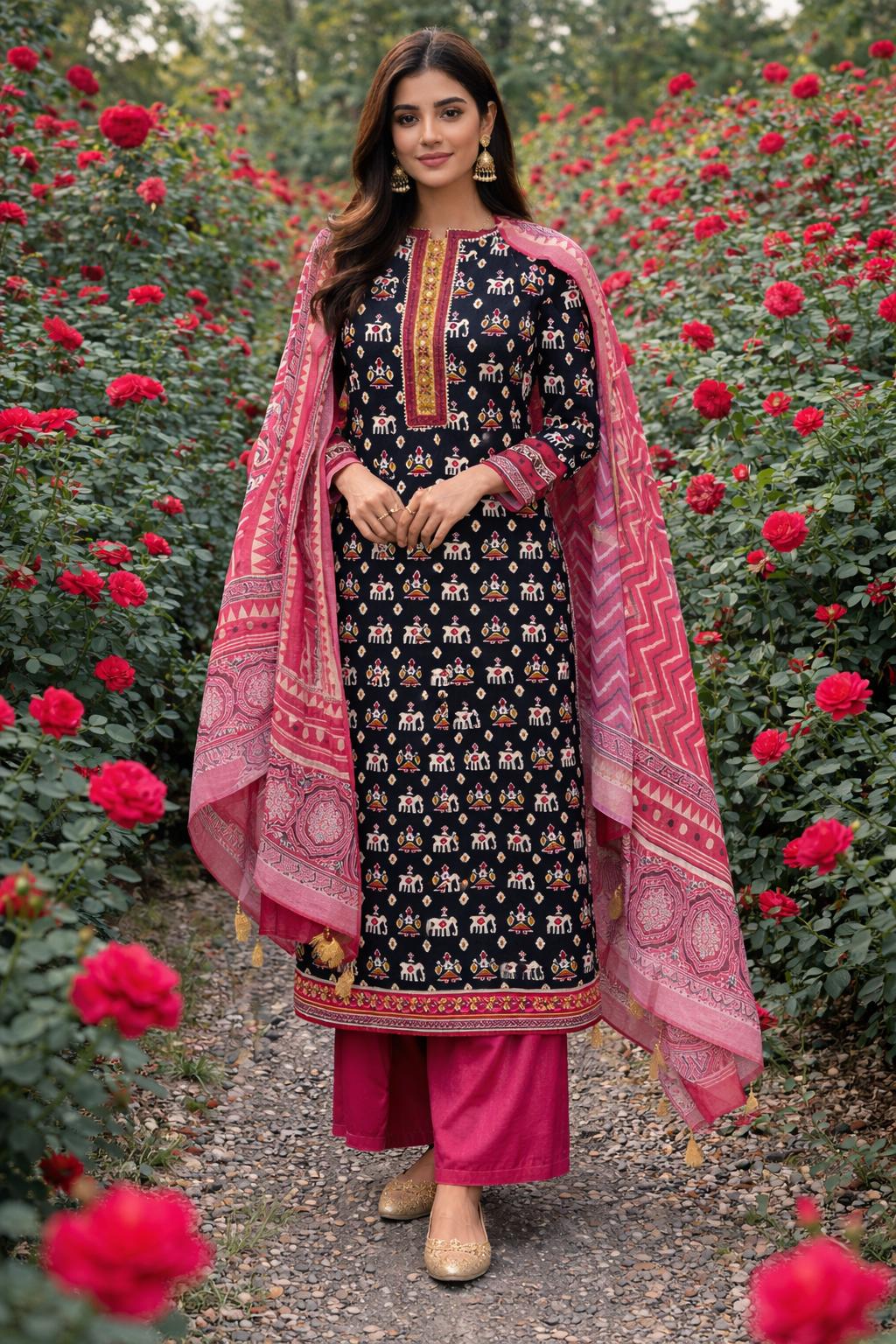 👉🏻This elegant suit is a beautiful blend of traditional motifs and contemporary styling. The kurta features a rich black base adorned with intricate elephant-inspired prints, giving it a classic ethnic appeal.
