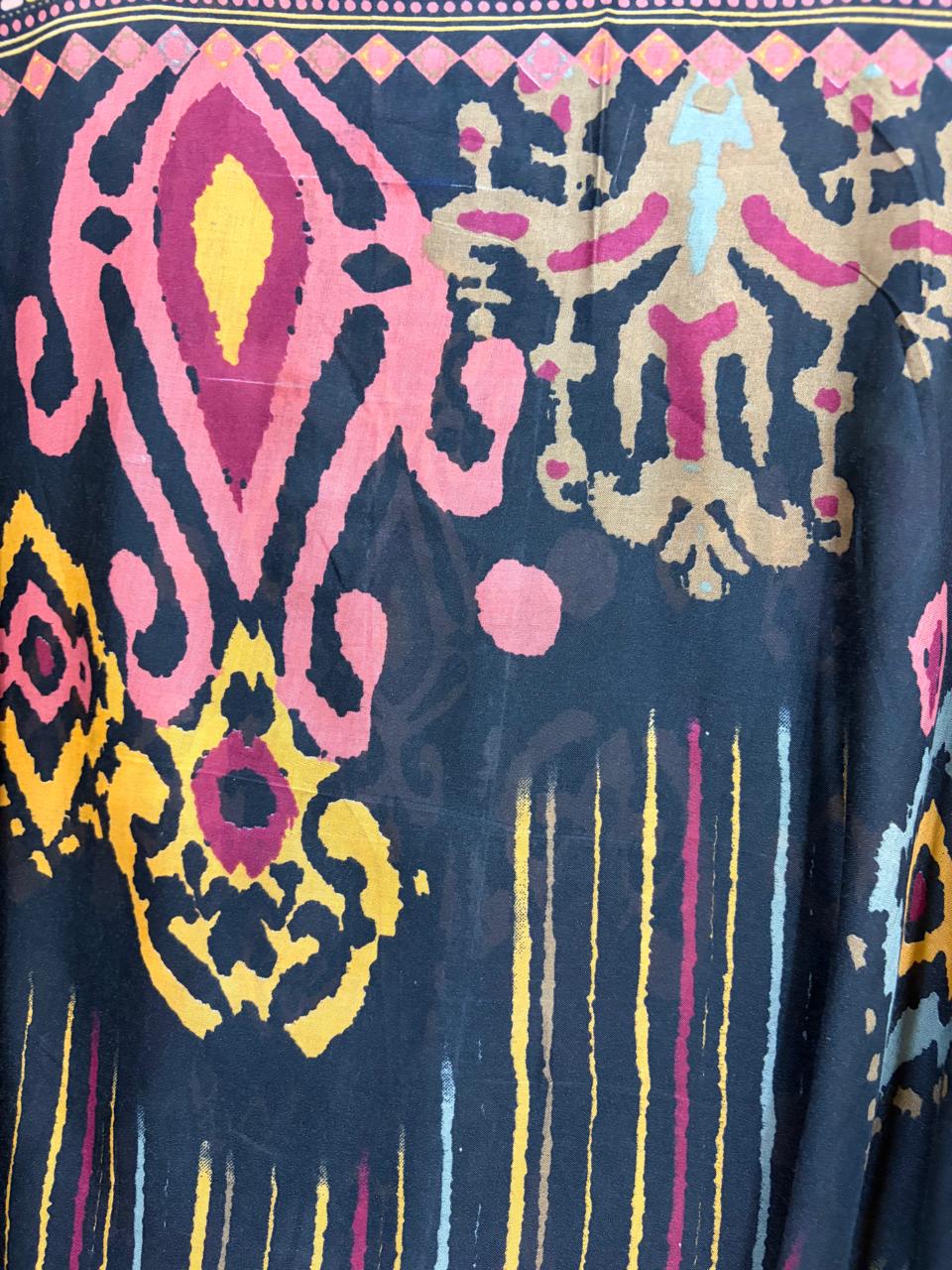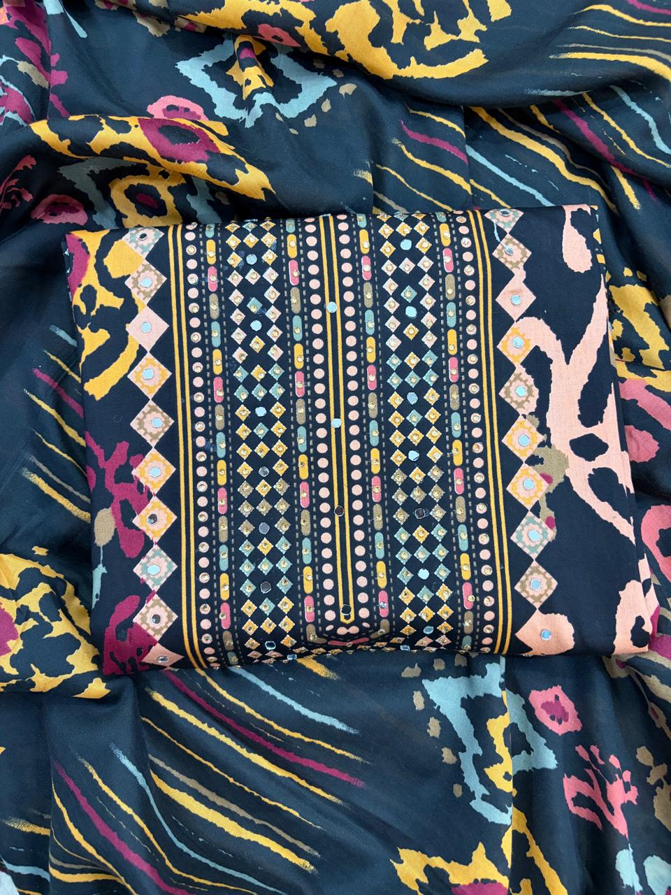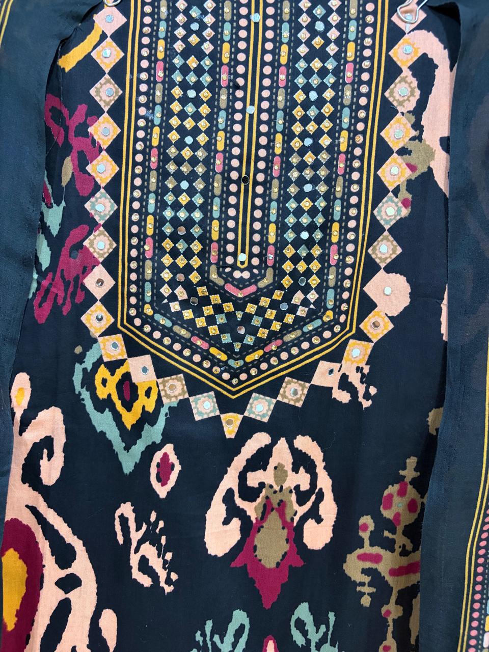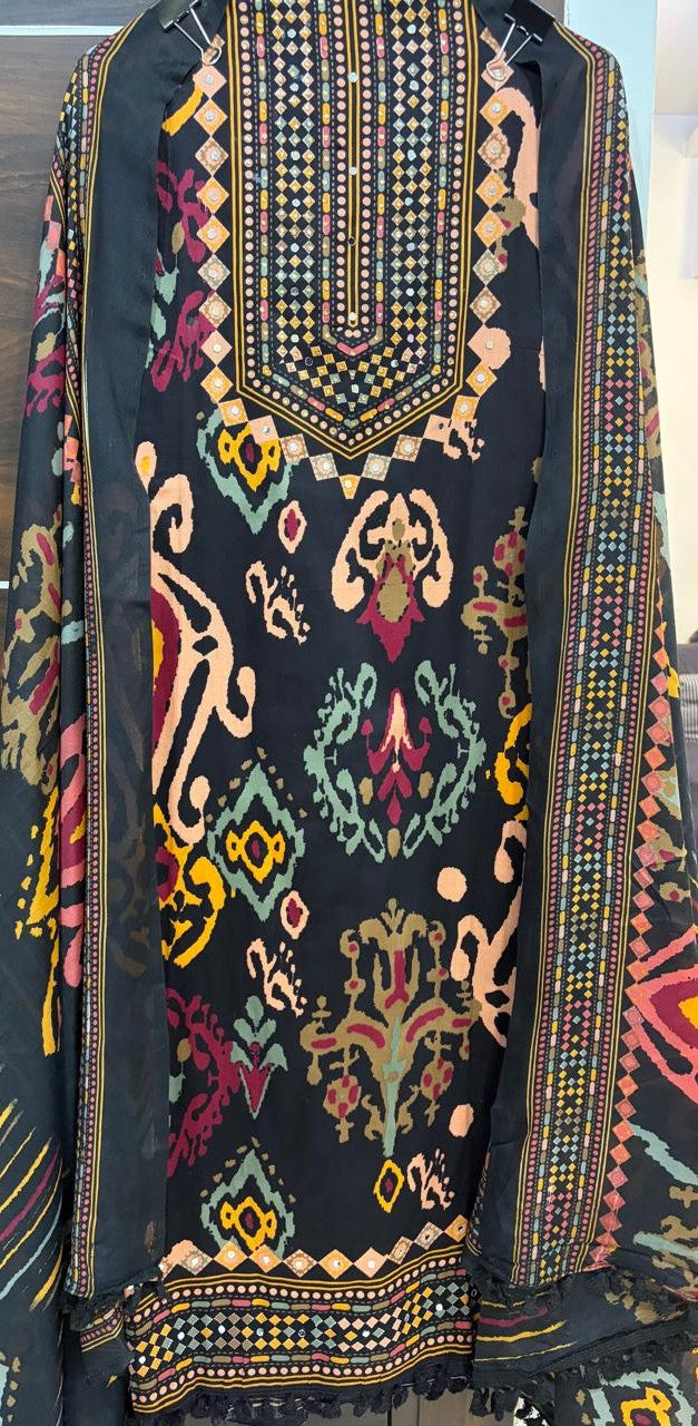 Deep black three-piece fabric adorned with striking Ikkat print across the fabric, offering a bold yet graceful visual appeal. Subtle mirror work around the neckline adds a delicate shimmer, creating a refined focal point without overpowering the design.