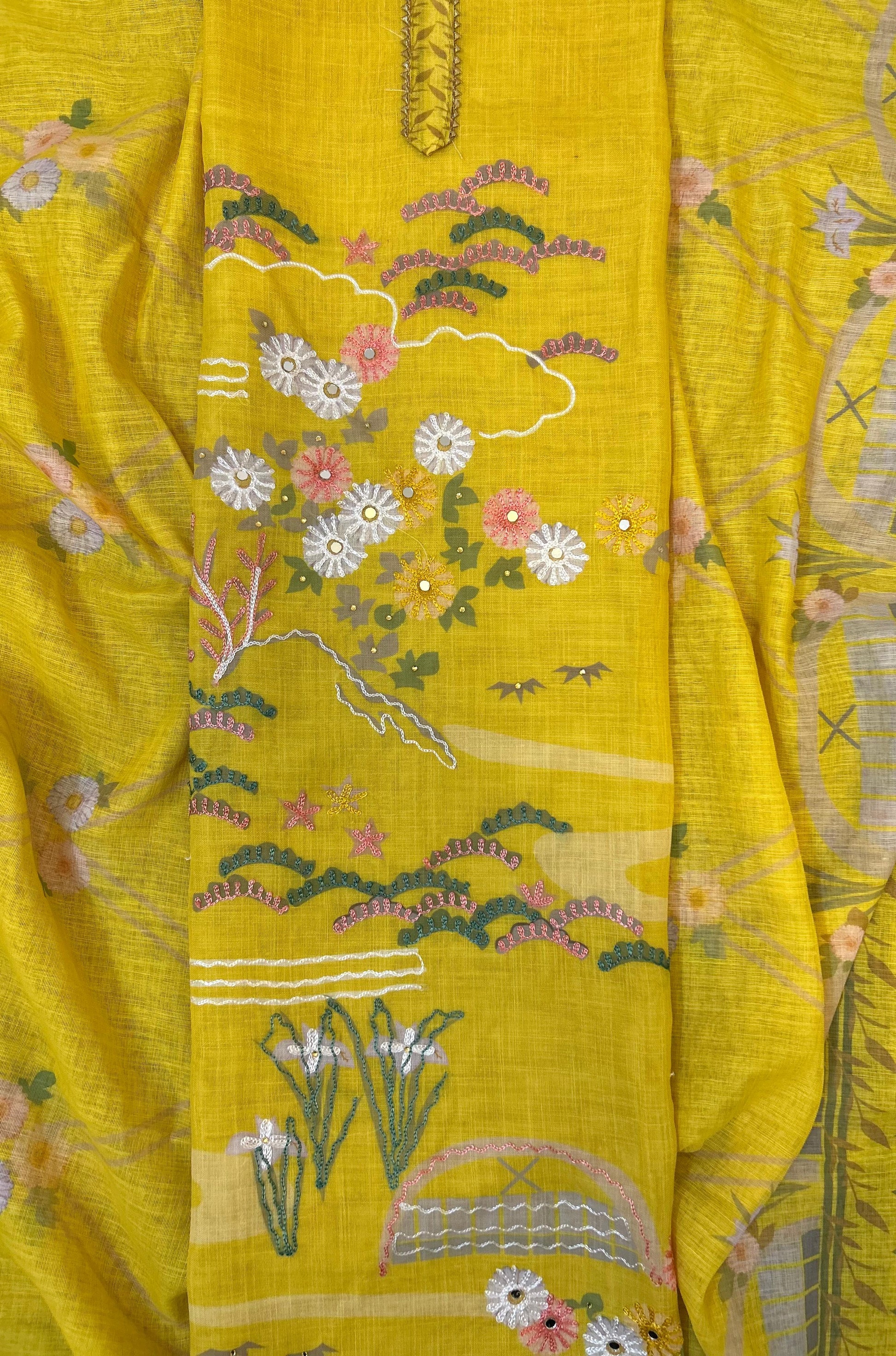 A sophisticated yellow linen suit featuring intricate embroidery on the shirt, perfect for adding a touch of grace to any occasion.